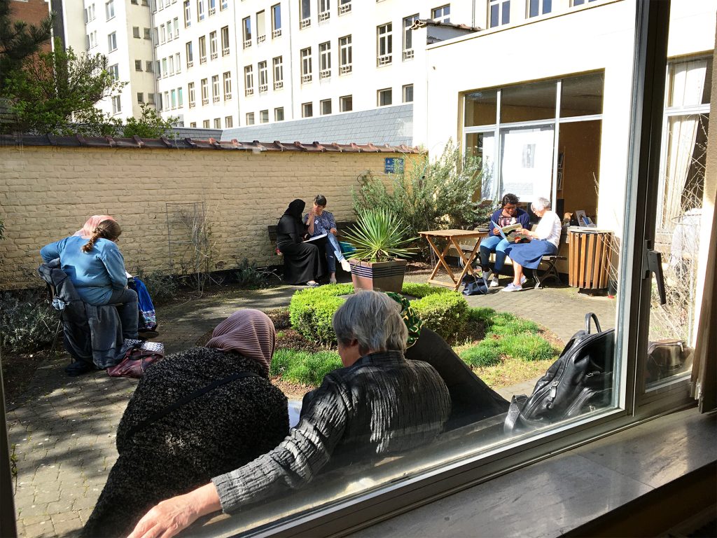 Dans le nouveau décret mission, les partenariats sont essentiels. Nous en avons avec les écoles, avec les associations comme La Ruelle (centre d’expression et de créativité), La Barricade (espace intergénérationnel), Paroles, Calame (école de devoirs), SIMA (centre d’insertion socio-professionnelle) (…). On est situé à côté du Centre Amazone (centre de congrès et d’associations féministes), de l’Université des Femmes et de la bibliothèque Léonie La Fontaine.