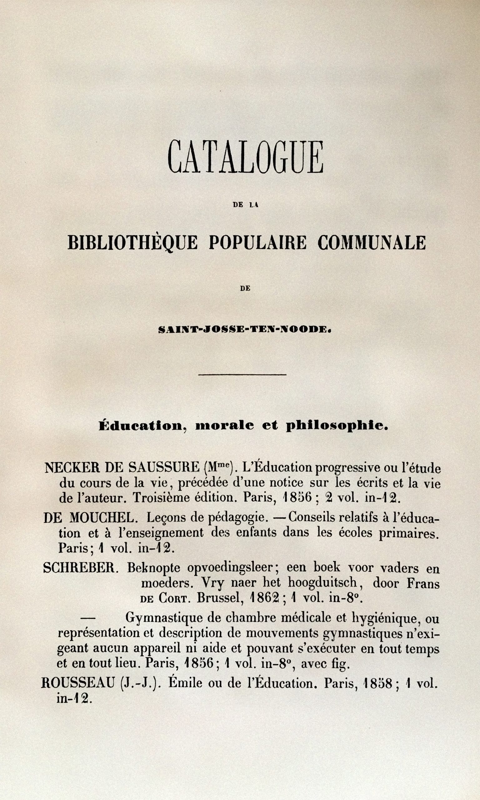 [35] Catalogue de la bibliothèque communale populaire de Saint-Josse-ten-Noode, Saint-Josse-ten-Noode, 1863, p. 4-5.[36]Administration communale de Saint-Josse-ten-Noode, « Rapport sur la situation et l’administration des affaires de la commune pendant l’année 1862-1863 », BC, séance du 9 octobre 1863, p. 198.