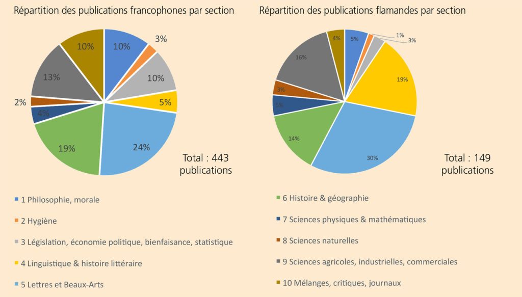 Un quart des 592 publications sont des écrits en langue flamande (149). 58% des 149 publications en flamand concernent les sciences humaines, avec, encore une fois, une part importante d’ouvrages dans la catégorie Lettres et Beaux-arts (30%). Les publications classées en Linguistique et histoire littéraire sont également nombreuses (19%) et représentent même plus de la moitié des 50 publications françaises et flamandes qui composent la section. L’histoire et la géographie constituent 14% des publications ; les sections relatives aux sciences techniques et naturelles concernent un quart des publications flamandes.