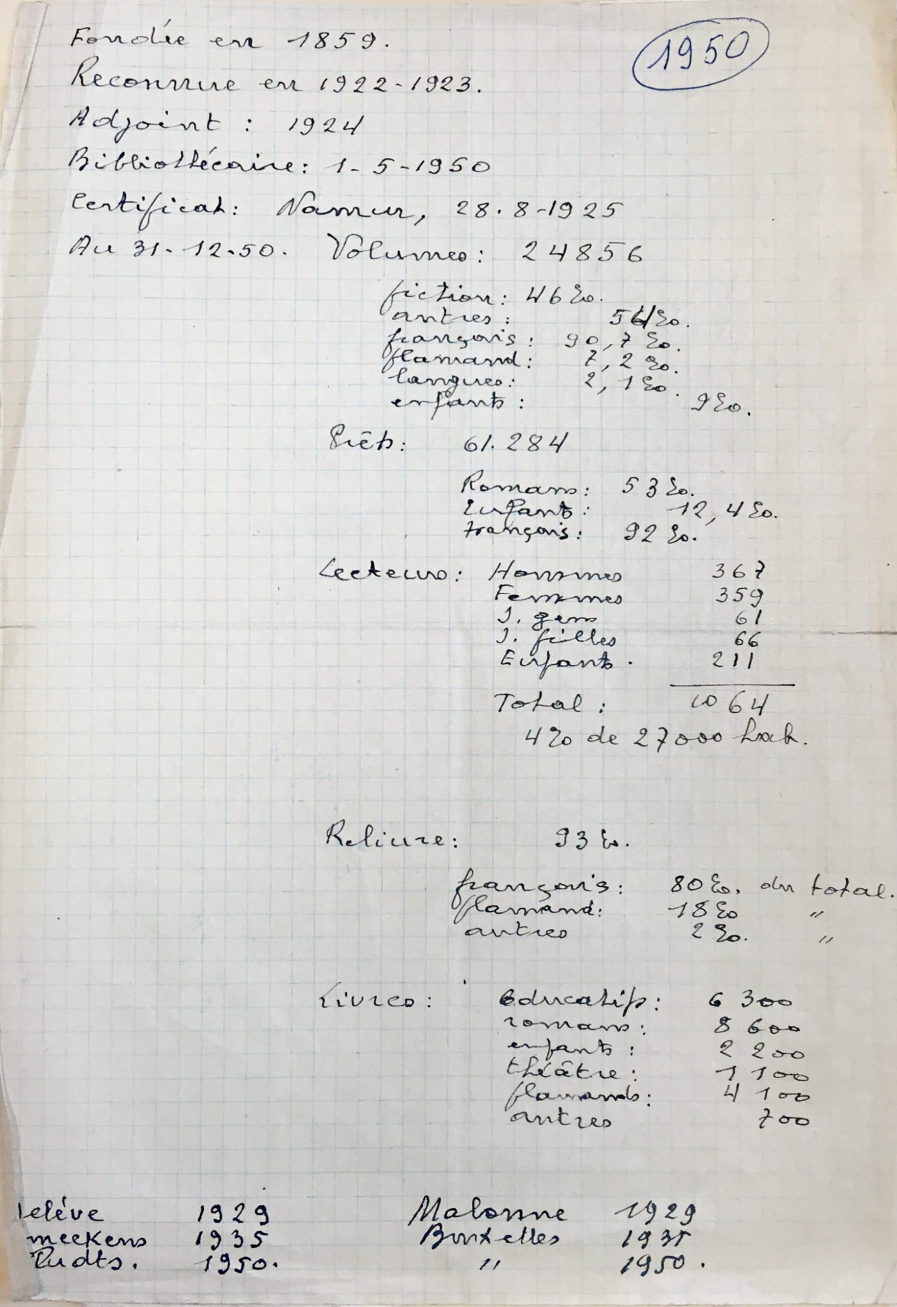 [60] Bibliothèque communale de Saint-Josse-ten-Noode, fonds archives anciennes de la bibliothèque, Registre. Statistique de l’année 1950. Ce document reprend la date de la création et la première année de subventionnement de la bibliothèque.