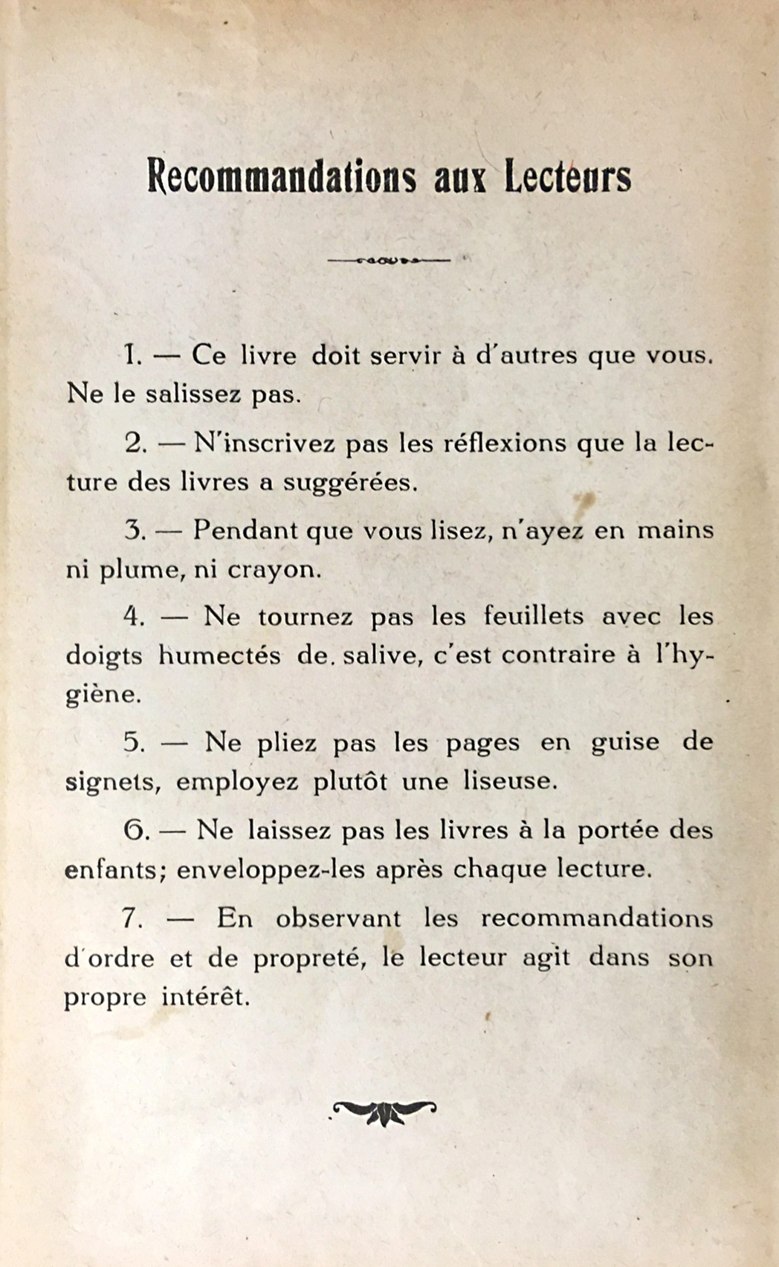Le règlement de la bibliothèque, révisé, est publié dans les premières pages du catalogue. La salle de lecture est accessible le dimanche matin de 9 à 12 heures et le lundi de 18 à 21 heures. Il est interdit de fumer, de causer ou de faire du bruit dans la salle de lecture. Il est interdit de calquer les gravures et les cartes, d’apposer sur les livres des marques, notes, réflexions ou de plier les pages.[35] Pour le reste, le règlement reprend les mesures adoptées précédemment.