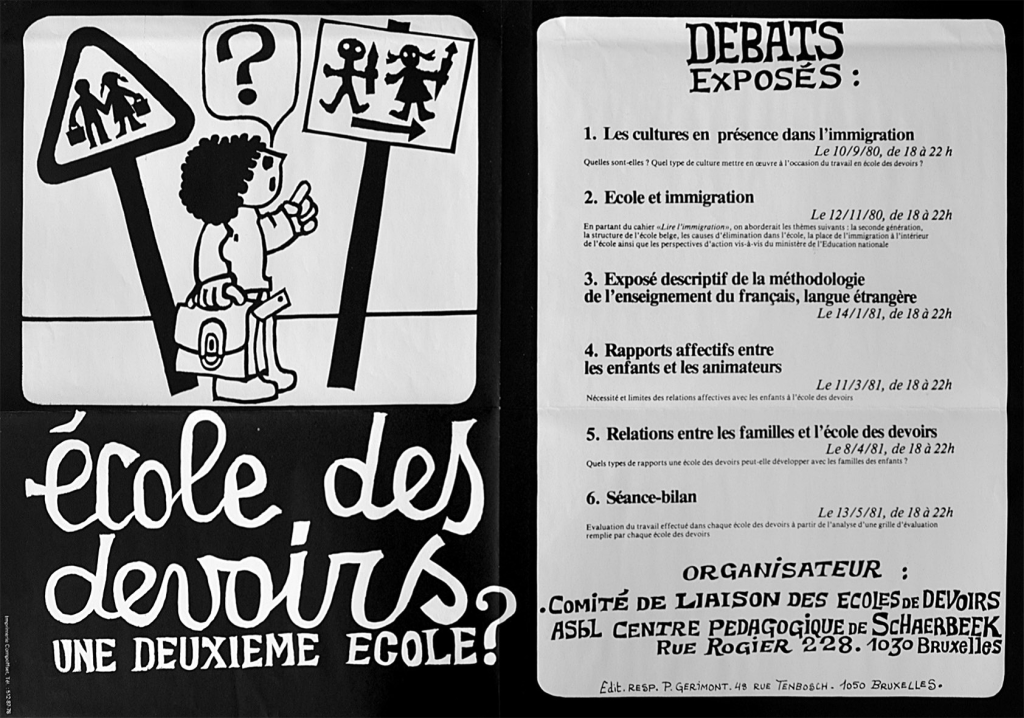 En juin 1979, les deux stagiaires remettent leur travail de fin d’études qui sanctionne la fin de celles-ci. Elles ont bon espoir que la dynamique lancée pendant leur stage se poursuivra. L’une d’elles continue comme bénévole à l’école de devoirs Hajitkoum. Patricia Gérimont reprend l’animation du Comité. Cette dernière, fonctionnaire à la Commission française de la Culture, section Immigration, soutient les écoles de devoirs depuis le début en 1975. Son engagement se fait à titre bénévole et militant[16]. Les rencontres se déroulent désormais au n° 228 de la rue Rogier, lieu qui héberge l’école de devoirs Hajitkoum et le Centre pédagogique de Schaerbeek asbl, la nouvelle dénomination du centre de documentation d’Hypothèse d’école. L’accent est mis sur la formation des animateurs et animatrices avec un programme qui se décline de septembre 1980 à mai 1981, avec cinq thématiques récurrentes : les cultures en migration, l’école et l’immigration, la méthodologie de l’apprentissage du français-langue étrangère, les liens affectifs entre enfants et moniteurs, les familles et les écoles de devoirs. La dernière séance de l’année est consacrée à l’évaluation du cycle et la préparation du programme de l’année sociale suivante.