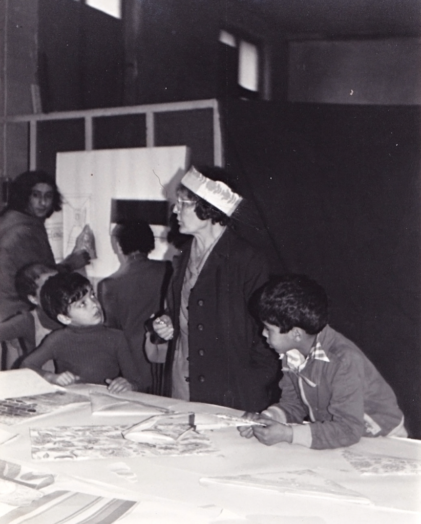 La deuxième journée de rencontre des écoles alternatives en quartier populaire est consacrée à la pédagogie de la libération. Elle se déroule le 15 mai 1977 à la Maison de quartier des Quais au n° 67, rue d’Ophem à Bruxelles, et a comme partenaire le Groupe d’action Bruxelles-sur-Senne. Sont invités les animateurs d’écoles de devoirs, mais également les moniteurs en alphabétisation, les militants des mouvements d’éducation populaire, les enseignants, etc.[5] La veille, le samedi 14 mai dans l’après-midi, une animation « L’École en folie » est réservée aux enfants fréquentant les écoles de devoirs[6]. Les activités proposées sont multiples : des expositions de dessins d’enfants, des ateliers (créer des dessins pour illustrer les mots, inventer des histoires et les mettre en diapositive), les ombres chinoises, des déguisements, la projection de dessins animés, etc. Rosa Collet[7] et Renée Ponette, animatrice bénévole à l’école de devoirs Rasquinet, dans le quartier Josaphat à Schaerbeek, en sont les chevilles ouvrières.