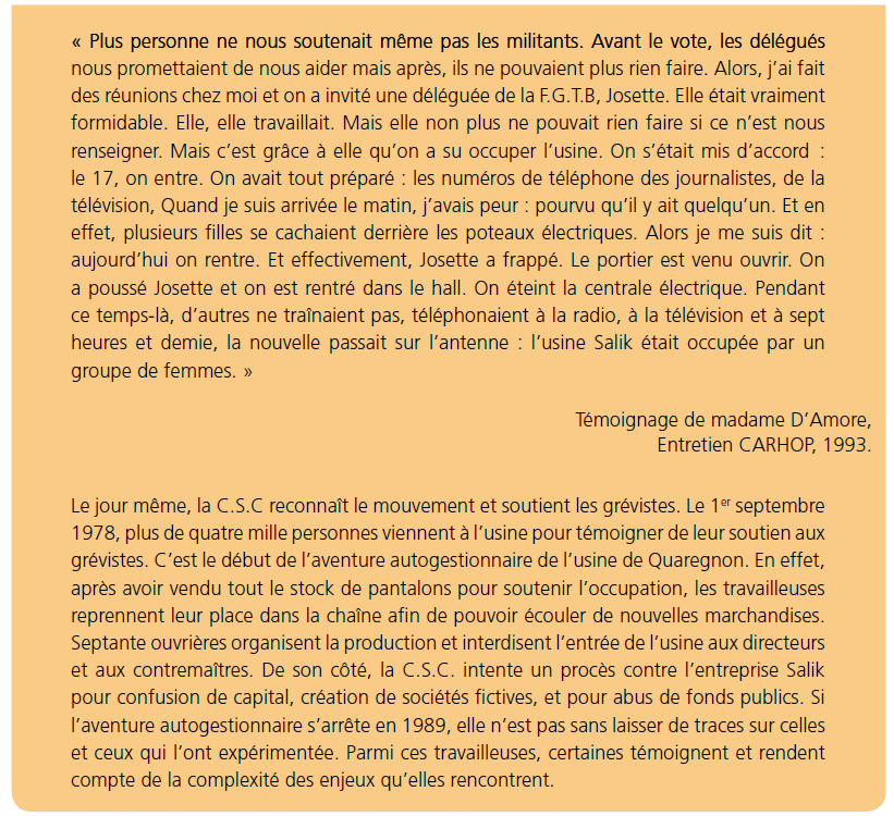 « Mon frère et moi étions de jeunes militants de la J.O.C. Avant l’occupation, ma mère nous reprochait tout le temps nos arrivées tardives et le fait qu’on aille manifester, distribuer des tracts et se faire bastonner par la police. Elle nous disait que ce n’était pas ça qui nous donnerait à manger ni nous ferait réussir nos études. Après la réunion qui a précédé l’occupation, elle s’est tout naturellement tournée vers mon frère et moi et nous a demandé comment on fait pour occuper une entreprise. Avec d’autres militants de la J.O.C., on lui a donné un canevas : il faut avertir la presse, mettre un comité de grève sur pied, prévenir les syndicats et essayer de conscientiser un maximum de gens pour vous soutenir dans votre action. À partir de ce moment-là, pour ma mère, tout a changé.