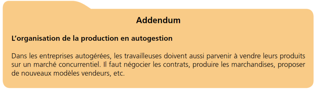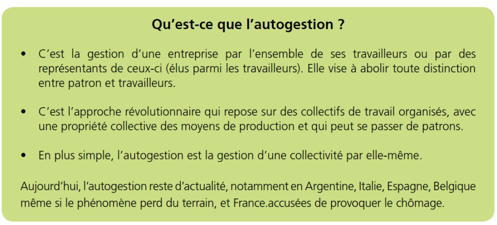 Ainsi, l’idée d’autogestion prend place dans les esprits. On théorise alors sur la possibilité de se passer des patrons en mettant sur pied des collectifs de travail, avec une propriété collective des moyens de production. En Belgique, la gauche chrétienne se montre sensible à cette forme d’organisation du travail. Puis, en 1973, l’occupation de l’usine LIP par ses ouvriers, qui s’organisent ensuite en autogestion, rend tangible cette théorie et impacte le monde ouvrier.