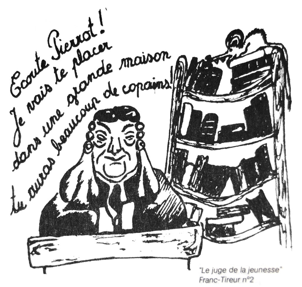 Dans le numéro deux du Franc-tireur a paru le premier épisode de la bande dessinée qui a pour héros Pierrot, enfant placé. L’histoire débute au moment où Pierrot comparaît devant son juge pour la première fois. Ce dernier, l’air visiblement satisfait de lui-même, assis confortablement à son bureau derrière lequel se profile une étagère pleine à craquer de toutes parts sous le poids des livres, s’écoute dire : « Écoute Pierrot. Je vais te placer dans une grande maison. Tu auras beaucoup de copains ! ». Le scénariste, qui est un enfant, fait répondre à Pierrot : « Mais je n’ai rien fait ».