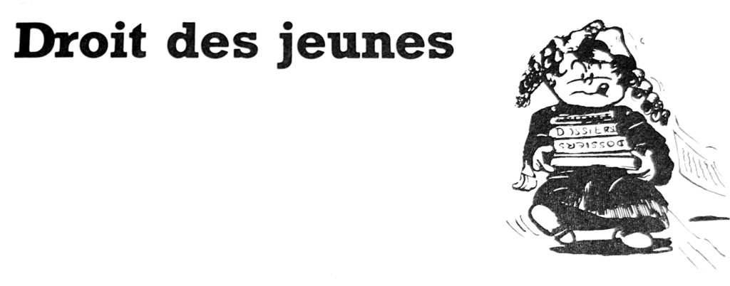 À partir de janvier 1979, La Gazette Parallèle ouvre une rubrique spécialement dédiée à la question du droit des jeunes. On y évoque le droit des jeunes dans ces multiples dimensions : le travail étudiant, les jeunes chômeurs, les allocations d’études, l’égalité des chances dans l’enseignement, les conditions des mineurs mis à la disposition du gouvernement en prison.