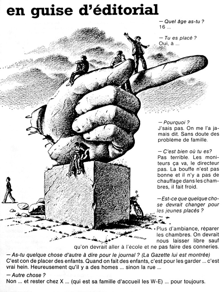 Enfin, c’est aussi au nom des droits des jeunes, que La Gazette Parallèle soutient et publie les revendications des travailleurs en maisons d’enfants : « Périodiquement ça bouge. « Ça », ce sont les travailleurs des maisons d’enfants, lassés d’un statut de laissés-pour-compte, miroir de l’importance que notre société accorde aux enfants dont ils s’occupent. Refuser ces revendications, c’est accepter de taire les exigences qu’on peut avoir vis-à-vis de ceux qui ont le sort de ces enfants entre leurs mains… »[51]