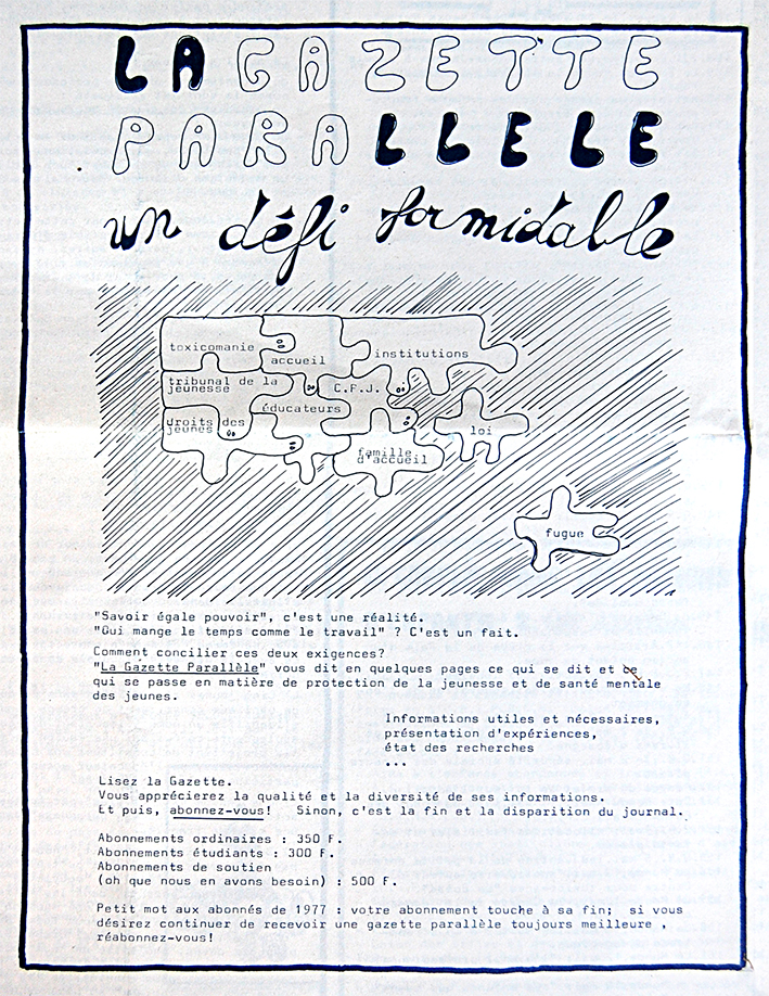 La revue La Gazette Parallèle, mensuel édité à Bruxelles et diffusé auprès des professionnels du travail social entre 1977 et 1984, est évoquée une première fois lors d’une réunion du comité d’accompagnement de la recherche, par l’un de ses anciens lecteurs, comme une source potentielle sur la période que nous étudions[4]. Par la suite, mes différentes rencontres avec des travailleurs sociaux révèleront que la lecture de La Gazette Parallèle à la fin des années 1970 et au début des années 1980 est souvent partagée. Mais les souvenirs s’arrêtent là… Plusieurs articles de La Gazette Parallèle sont en outre régulièrement cités dans la littérature spécialisée des secteurs psycho-médico-sociaux des années 1980[5]. J’ai souhaité revenir sur les traces de ce projet[6].