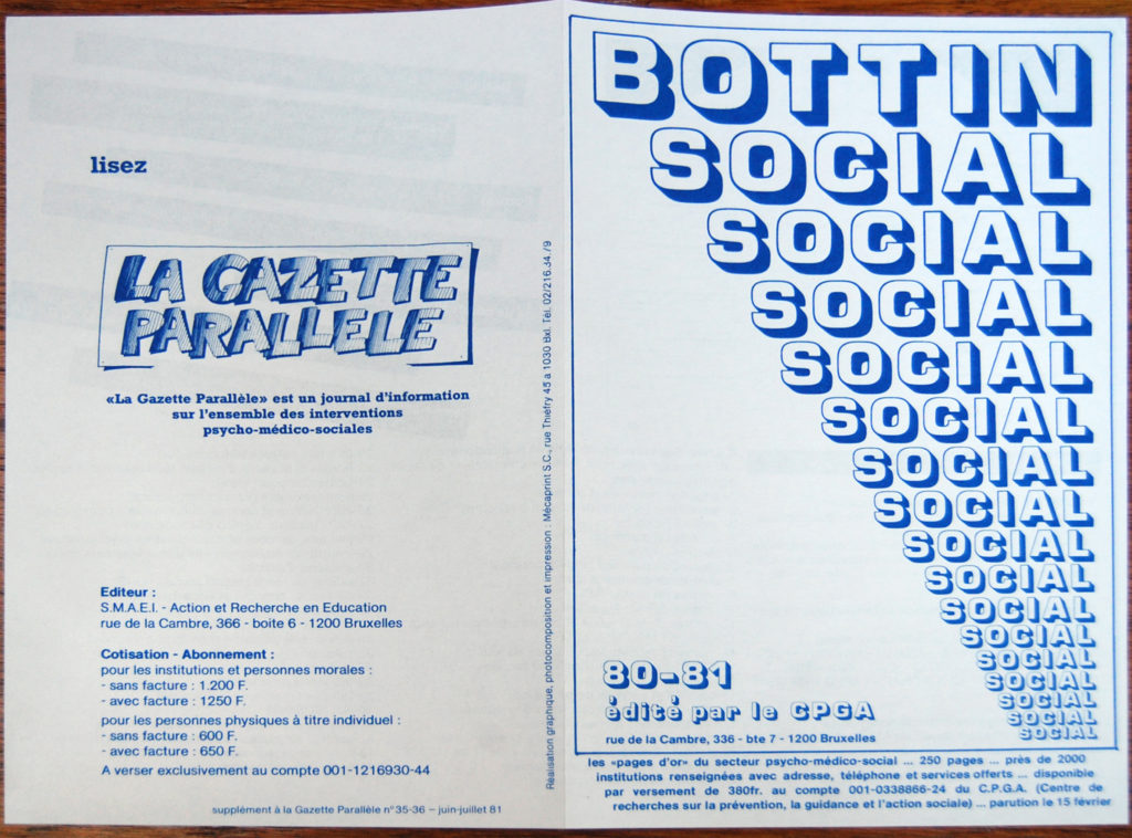 Si cette dimension plus « marketing » convient au Bottin social (il s’agit d’un « outil de travail » qui se vend), elle est plus difficilement applicable à La Gazette Parallèle qui est un produit un peu plus « marginal » ou confidentiel, dont les abonnements (bien que constants, environ 1 000) ne suffisent pas à soutenir financièrement le projet. En décembre 1980, une convention est conclue entre le CPGA et le SMAEI – Action et recherche en éducation[55], dont Marc Impe, impliqué dans l’équipe de rédaction de La Gazette Parallèle à ses débuts, est le directeur. L’une des raisons de la convention est la possibilité d’accéder à des subventions. Cette convention prévoit que « le CPGA confie au SMAEI la réalisation technique et financière de La Gazette Parallèle sans toutefois céder la propriété intellectuelle et la conception de celle-ci »[56].