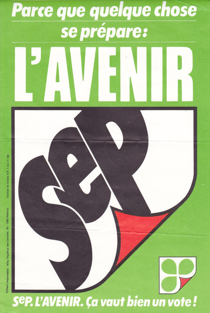 Outre les archives de SeP, conservées au Carhop, deux témoignages ont servi à la rédaction de cet article. Jeanine Cornet et Diana De Crop, respectivement responsable de la communication et attachée de presse du parti en 1985, ont accepté de se prêter au jeu de l’interview. Leurs souvenirs, bien que parcellaires, car les faits remontent à près de 35 ans, viennent enrichir et donner du relief à ce que dévoilent les archives de SeP.[3]