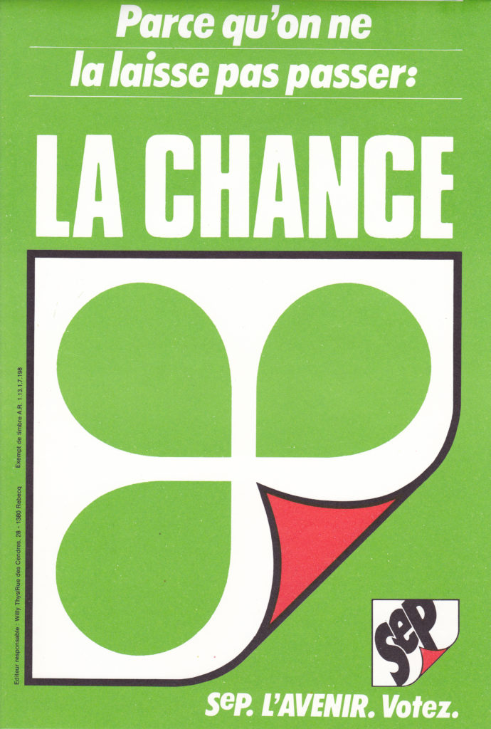 C’est, en effet, à André Piroux, graphiste du Design Studio, qu’on confie les visuels du jeune parti. C’est à lui également qu’on doit le slogan de SeP : « C’est parti, c’est un parti, c’est partout », ainsi que différentes phrases d’accroche prévues pour la campagne.[4] Présenté aux militant·e·s lors de l’assemblée constitutive du parti, l’ensemble rencontre un franc succès. Dans un premier temps, le logo sera limité au nom : “SeP”. Celui-ci est « remplacé au printemps par un trèfle à trois feuilles vertes avec une petite pointe de rouge à l’endroit où aurait dû venir la quatrième feuille. Pour accentuer le symbolisme, une distribution de raviers de trèfles à cultiver a été effectuée auprès des militants de base ».[5]