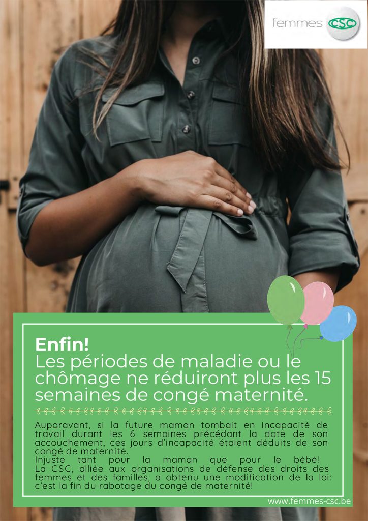 Pour les femmes CSC, garantir les 14 semaines de congé postnatal est fondamental. Cette revendication, cela fait plus de 15 ans qu’un front commun, composé d’organisations féministes et de femmes, des groupes femmes des syndicats et de la Ligue des familles cherche à l’obtenir, sans succès. Déjà dans la deuxième moitié des années 1980, Vie Féminine (VF) et le service syndical des femmes de la CSC formulent des propositions de modification du congé de maternité vers un allongement à 16 semaines au total, avec deux semaines à prendre obligatoirement avant la date prévue d’accouchement. À l’époque, le congé est de 14 semaines et si la proposition se limite à deux semaines supplémentaires, la justification est entre autres qu’il ne faut pas « pénaliser davantage la femme sur le marché du travail ». Un argument que reprennent d’ailleurs aujourd’hui les femmes CSC, car plus une femme s’absente longtemps du marché de l’emploi, plus elle a de difficultés à s’y réinsérer, souligne Gaëlle Demez. Vie Féminine et la CSC, demandent à ce que « les absences pour maladie qui surviennent pendant les 4 semaines précédant le congé prénatal obligatoire et pour d’autres raisons que celles liées à l’état de grossesse, ne peuvent entamer les 4 semaines à prendre facultativement avant ou après l’accouchement ». La justification est simple : ne pas confondre grossesse et maladie. Des arguments, encore une fois, assez similaires à ceux développés aujourd’hui. Toutefois, si le congé est porté à 15 semaines en 1990, durée toujours en vigueur actuellement, les autres propositions n’aboutissent pas et durant de nombreuses années la situation n’évolue plus.