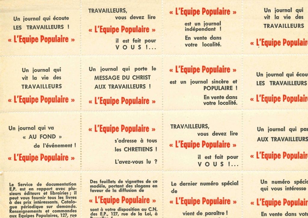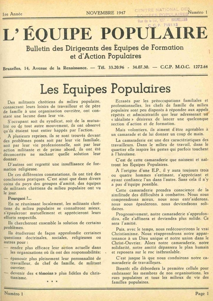 Dès novembre 1947, le premier numéro de L’Équipe Populaire est édité. C’est un bulletin mensuel destiné aux « Dirigeants des Équipes de Formation et d’Action Populaires ». Celui-ci propose des courts articles de réflexions personnelles, des suggestions pour l’animation des réunions, des conseils pour toucher un public plus large, des témoignages sur les conditions de travail ou la vie familiale… Son public cible : les hommes adultes (à cette époque, il y avait la Jeunesse ouvrière chrétienne pour les jeunes et la Ligue ouvrière chrétienne féminine pour les femmes), membres d’organisations du MOC et leurs proches, ainsi que les milieux paroissiaux. Il est important de souligner la proximité avec les institutions religieuses et la foi chrétienne fortement ancrée des initiateurs du mouvement Équipes Populaires.