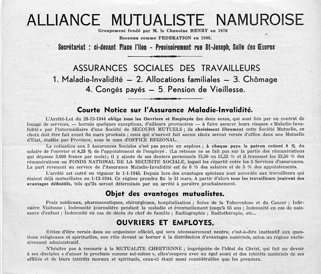 Depuis les années 1930, la plupart des fédérations mutualistes, quelle que soit leur appartenance philosophique, développent une politique médico-sociale dont le but est d’offrir à leurs membres l’accès à une médecine de qualité à prix modérés. À partir du 1er janvier 1945, l’arrêté-loi sur la sécurité sociale obligatoire voté le 28 décembre 1944 est d’application. L’assurance maladie-invalidité, libre jusqu’alors, devient obligatoire.