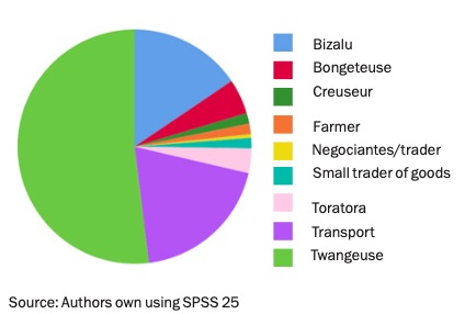 En 2020, nous avons effectué une recherche de terrain afin de tenter de comprendre dans quelles catégories de travail les femmes sont impliquées dans le secteur minier de l’or en RD Congo. Sur un nombre total de 225 femmes, un très grand pourcentage d’entre elles sont des « twangeuses », suivies des transporteuses et des « bizalous » et ensuite nous avons les « bongeteuses » et les « toratora ». Très peu de femmes se retrouvent dans d’autres types d’activités.