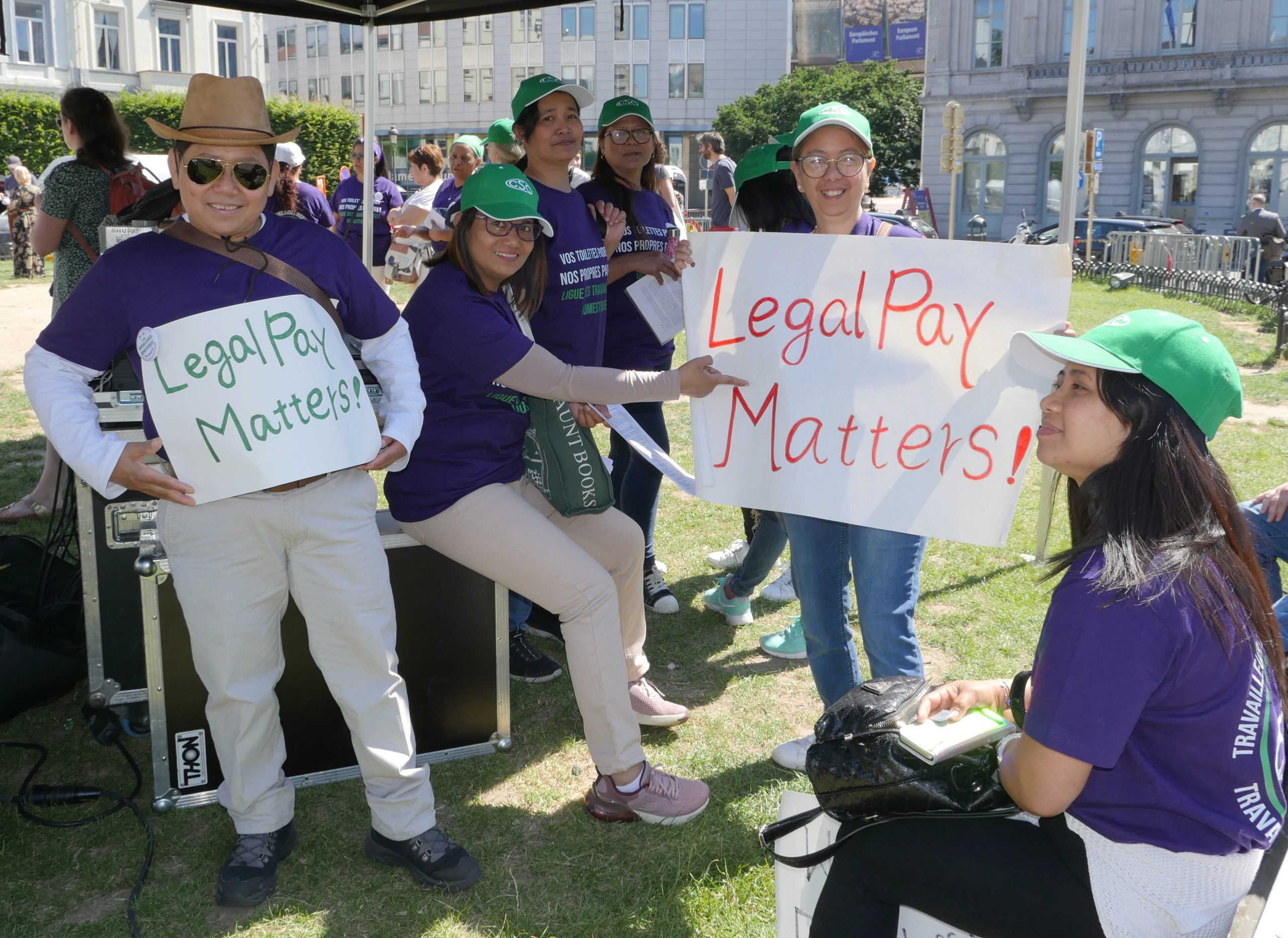 Vient ensuite l’idée de se revendiquer « travailleuses domestiques ». Les femmes de la Ligue ne sont pas seulement membres du Comité des travailleurs et travailleuses migrant.e.s avec et sans-papiers de la CSC Bruxelles, elles s’affichent, se reconnaissent et s’identifient vers l’extérieur comme des travailleuses domestiques. Cette stratégie, elle s’inscrit dans le prolongement du modèle suisse « Papyrus » poursuit Eva. En février 2017, le canton de Genève initie ce projet permettant la régularisation de près de 3 000 travailleurs et travailleuses sans-papiers résidants depuis plusieurs années dans le canton . Or, la Ligue est en contact avec la plateforme de soutien aux sans-papiers genevois. Elle invite deux fois à Bruxelles le Suisse Thierry Horner, secrétaire du Syndicat interprofessionnel des travailleuses et travailleurs (SIT), qui lorsqu’il est interrogé à propos du modèle « Papyrus », déclare : « on peut faire peur avec les sans-papiers. Mais ça ne marche pas d’avoir peur de la petite nounou brésilienne ». Alors, comme en Suisse, la Ligue continue son combat en véhiculant les portraits des femmes qui en sont membres, qui travaillent dans les secteurs des soins, de l’aide à la personne, du nettoyage et en lançant la campagne « Legal pay matters » le 16 juin 2022, rappelant aux responsables politiques bruxellois.es la nécessité d’instaurer une égalité de droits entre les travailleurs et travailleuses.