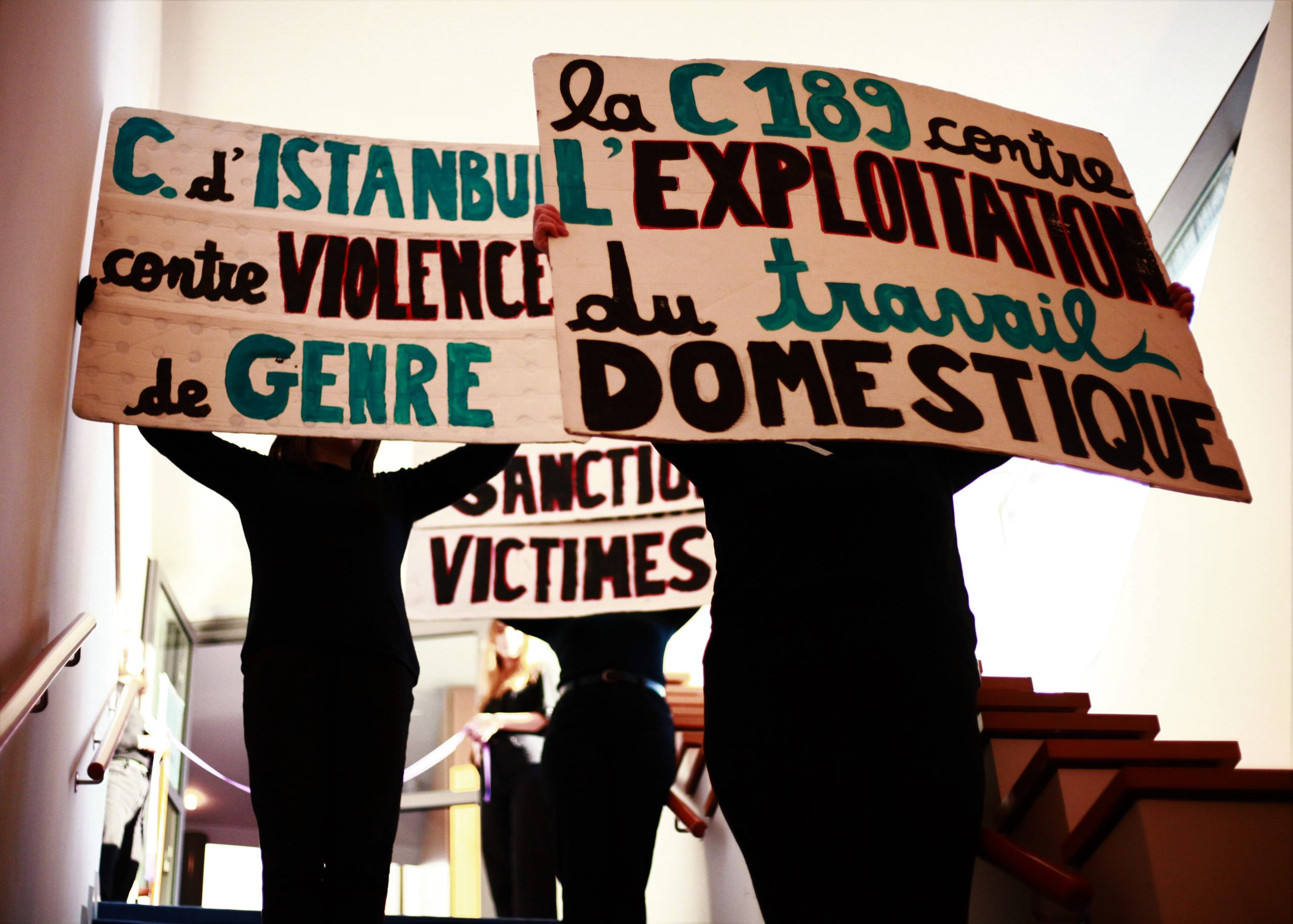 Ce groupe de femmes coordonné par Anna Rodriguez travaille en étroite collaboration pendant plus d’un an avec Solidarité Mondiale WereldSolidariteid (WSM), la CSC-ACV et particulièrement la Centrale Alimentation et Services de la CSC, présidée par Pia Stalpaert, afin de participer à l’élaboration de la convention n° 189 de l’OIT sur les travailleuses et travailleurs domestiques . L’OIT, une agence spécialisée de l’Organisation des Nations Unies (ONU), a pour mission de rassembler les gouvernements, employeurs et travailleurs et travailleuses de ses États membres dans le cadre d’une institution tripartite, en vue d’une action commune pour promouvoir les droits au travail, développer la protection sociale et renforcer le dialogue social. Des déléguées du groupe partent à Genève, ville dans laquelle se déroule la réunion de l’OIT cette année-là, afin de participer aux réunions de travail. Eva tient à souligner le travail exceptionnel réalisé avec le soutien d’Anna Rodriguez mais également de Nancy Tas alors permanente syndicale de l’alimentation et titres-services ACV et de Pascale Maquestiau, aujourd’hui responsable femmes CSC dans le Brabant Wallon. Pour le groupe, l’adoption de cette convention marque une victoire historique : « elles y ont participé et cela a été un moment très fort dont nous parlons encore à l’heure actuelle ».