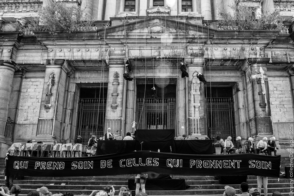 Le vendredi 14 juin 2024, à la veille de la journée internationale du travail domestique et quelques jours après les élections politiques européennes, fédérales et régionales, les militantes de la Ligue des travailleuses domestiques de la Confédération des Syndicats Chrétiens (CSC) de Bruxelles, avec le soutien du Mouvement Ouvrier Chrétien (MOC) de Bruxelles, se mettent en grève. La Ligue en profite pour organiser un événement retraçant son parcours historique de lutte. Elle établit par la même occasion le 1er gouvernement du courage politique, gouvernement symbolique dont les protagonistes sont interprétées par les militantes elles-mêmes. Aux pied du Palais de Justice de Bruxelles, les revendications, critiques et témoignages se succèdent devant plusieurs centaines de personnes. Sous un ciel gris et dans le froid d’un printemps qui n’arrive pas, l’assemblée passe du rire aux larmes, tant certains parcours de vie sont rudes et émouvants. Pourtant, malgré les difficultés, ces femmes luttent ensemble pour leur dignité. Elles revendiquent une protection juridique contre les abus, une régularisation et un accès aux formations professionnelles dans les métiers en pénurie. Quelques jours avant cette échéance importante, j’ai la chance de rencontrer Eva Jimenez Lamas et Magali Verdier, les deux coordinatrices de la Ligue, dans leurs bureaux de la rue Pletinckx, située au centre de Bruxelles. Pour cette contribution, elles proposent d’aborder la thématique des revendications pour les droits des femmes en les développant sous l’angle syndical. Elles retracent les origines de la Ligue, ses combats, ses revendications et les stratégies élaborées pour obtenir le respect du droit de chaque travailleur et travailleuse à être défendu et de cotiser à la Sécurité sociale.