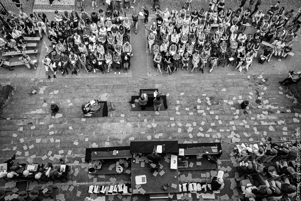 Magali complète les propos de sa collègue en évoquant l’importance du partenariat avec le monde artistique afin de visibiliser les travailleuses domestiques : « travailler avec l’art, avoir une image différente dans l’espace public dans la manière de se vêtir, dans la manière de faire des banderoles, dans la manière de dire des choses ». Je dirais qu’une des spécificités de la Ligue, poursuit Magali, c’est d’axer le travail dans le « champ culturel en travaillant avec différentes collaboratrices qui étaient féministes (…) avec des collectifs indépendants ou des personnes (…) qui soutenaient la lutte des migrantes. On a travaillé avec des journalistes, on a travaillé avec des photographes, on a travaillé avec des cinéastes (…) avec des comédiennes ». À l’occasion de leurs sorties dans l’espace public, les femmes de la Ligue se mettent en scène : « À chaque fois, on théâtralisait (…) on déroulait le tapis rouge devant le Parlement, on avait des T-shirts violets. Et ça c’est vraiment important, cela fait un peu « com » mais vraiment, il y a une identité, il y a des costumes, il y a une voix et elles sont « repérées » dans l’espace public. (…) Par le biais du théâtre, les artistes travaillaient, à la fois avec Eva sur la question de tout le contenu politique, et sur comment le transformer de manière théâtrale, qu’il soit compréhensible par tout le monde ».