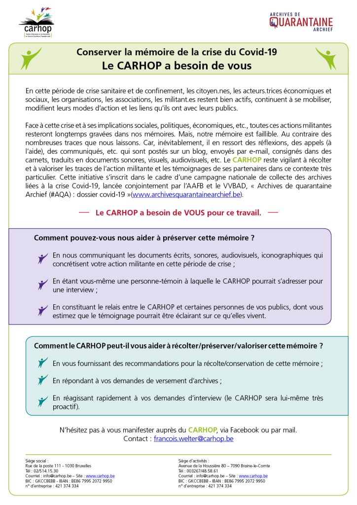 À partir de la mi-mars 2020, la crise aigüe de la Covid-19 met au premier plan la nécessité de mobiliser l’histoire sociale. Pour reprendre les termes d’une carte blanche rédigée par un collectif d’historien.ne.s et de sociologues dès le 14 avril 2020, il s’agit de « mettre en lumière les expériences contrastées et multiples de la pandémie selon les lieux, les genres et les âges et ainsi [d’]écrire une histoire ordinaire de l’extraordinaire »[18]. Cependant, le confinement contrarie le travail des historien.ne.s du CARHOP. Les animations auprès des publics, la récolte de leurs témoignages et la mise en perspective historique de ceux-ci étant suspendues pour une durée indéterminée, les ressorts de leur travail d’éducation permanente sont affaiblis. La récolte de traces de la crise en cours est également suspendue à une méthodologie à définir. Moins de quinze jours, en réalité. Car, un réseau d’archivistes, dont des travailleur.euse.s du CARHOP, se mobilise rapidement. Composé de personne issues d’horizons différents, celui-ci entend ne pas laisser se diluer la mémoire d’une période aussi particulière que potentiellement éphémère : le confinement. Il ne faut pas un mois avant que la plateforme « Archives de Quarantaine Archief » (AQA) ne voit le jour[19]. Celle-ci est l’incitant qui permettra au CARHOP de déployer de nouvelles stratégies de prospections et d’inscrire la crise en cours dans une historicité. Dans la foulée de la mise en ligne de la plateforme, le CARHOP publie des appels à témoignages parmi ses réseaux.