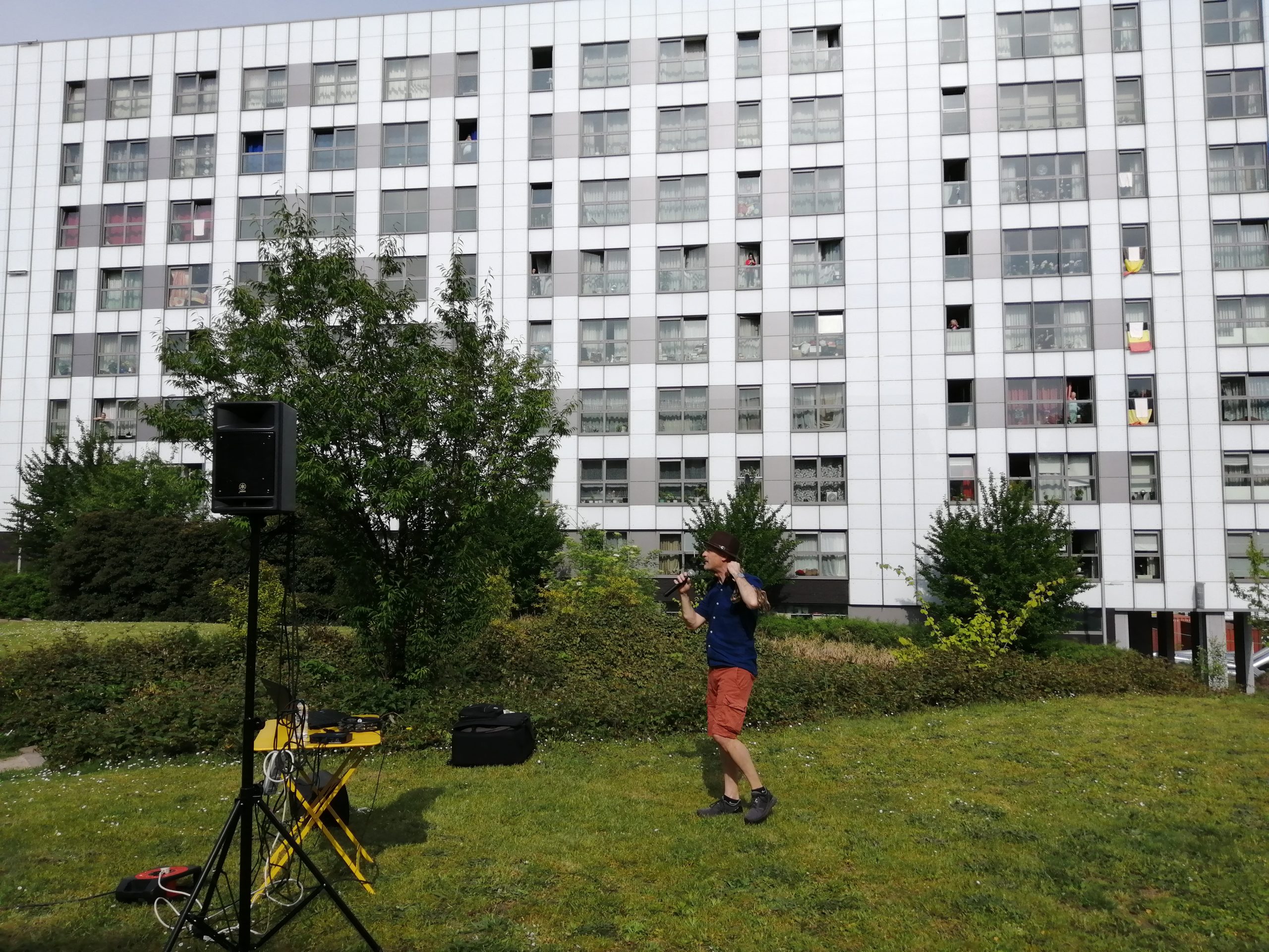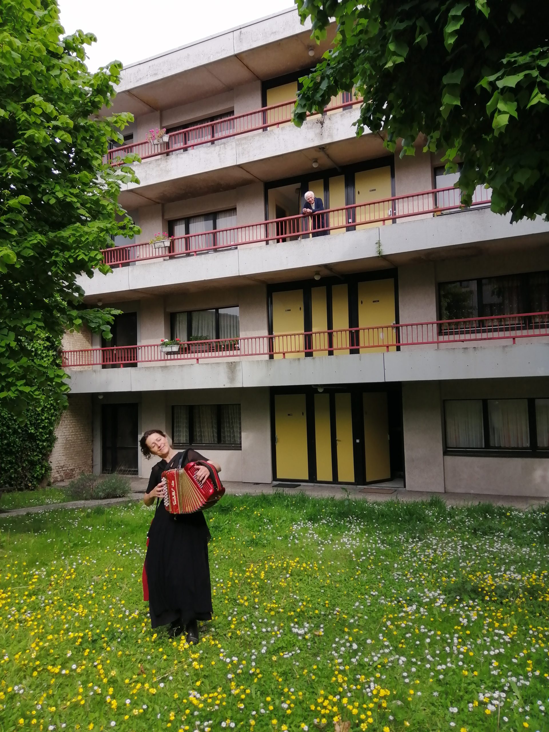 Pendant la période de confinement, l’échevine de la Culture, Delphine Houba[7], m’a confirmé que nous gardions le subside de la fête de la soupe. Je lui ai alors parlé du projet « Ouvrez votre fenêtre », qu’elle a soutenu. Elle est venue avec nous en bas des fenêtres et nous a facilités l’obtention des autorisations administratives.