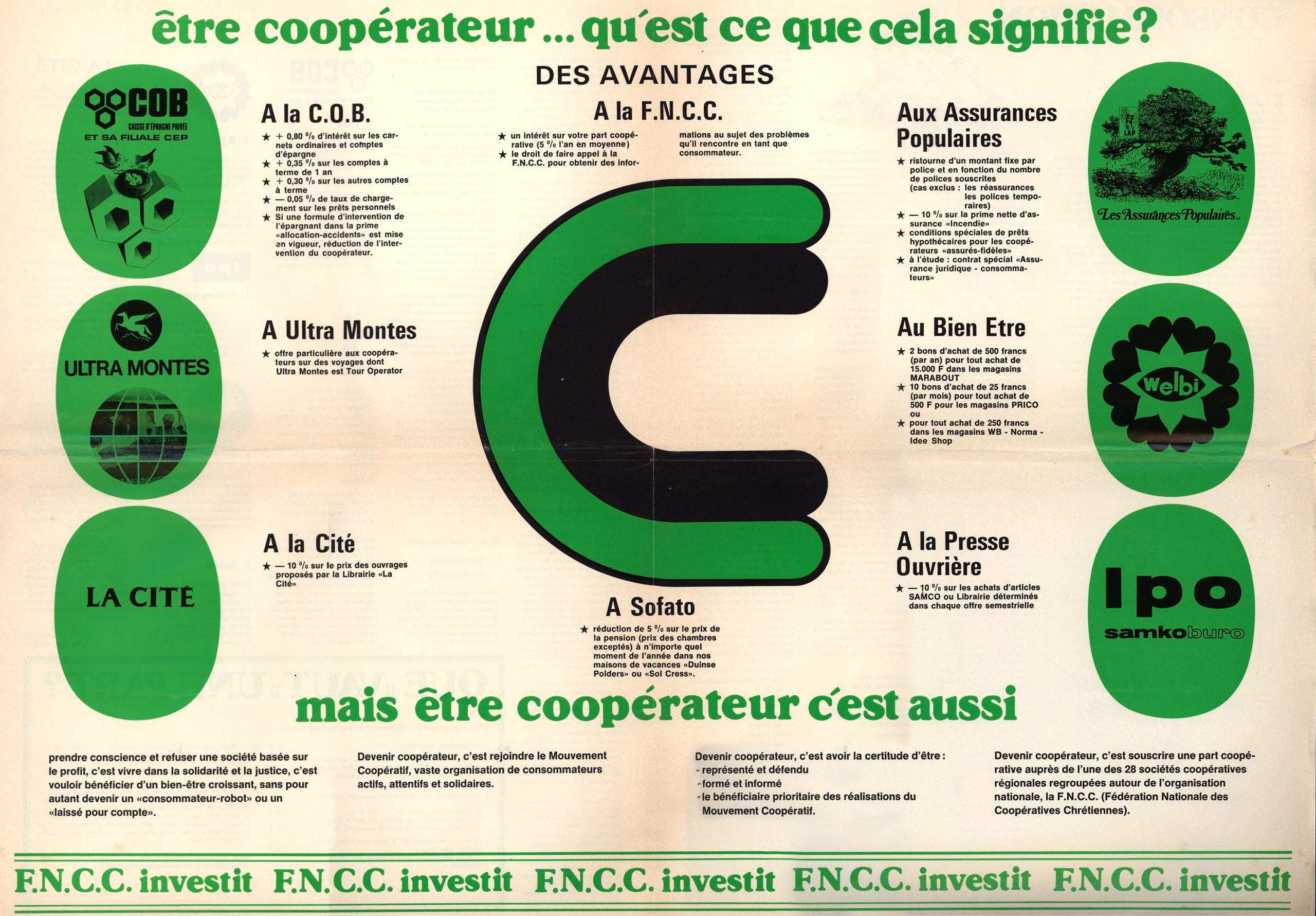 Durant trente ans, le mouvement coopératif chrétien se développe dans une conjoncture économique favorable. Les politiques d’expansion économique du gouvernement libéral-chrétien de Gaston Eyskens en 1960 (Loi unique) , la mise en place d’un marché commun européen, l’implantation de nombreuses entreprises en Flandre et l’élévation du niveau de vie général des Belges contribuent à l’épanouissement du secteur coopératif. Les ambitions de la FNCC sont importantes en termes de seuils de coopérateurs et de capital à atteindre. Si les résultats resteront toutefois en deçà des objectifs fixés, l’expansion est incontestable avec 428 037 coopérateurs et coopératrices dans les années 1980 (un doublement depuis 1968) et un capital qui quintuple sur la même période : l’intégration des sociétés namuroises et luxembourgeoises, jusqu’alors en marge de la FNCC n’y est pas étrangère. Aussi, le mouvement coopératif chrétien mène une politique de diversification de ses offres de service et favorise l’implantation de nouvelles coopératives, afin de répondre aux besoins nouveaux. L’économie coopérative ne cesse de renforcer son ancrage dans l’économie du pays, à force de formations, de journées d’étude, de commissions, de campagnes de promotion, parfois en lien avec les organisations sociales du Mouvement, et de services aux consommateurs et client.e.s (service d’assistance juridique, modernisation des commerces de son réseau, nouvelles offres bancaires et d’assurance, etc.) ; élément non négligeable, la FNCC intègre les organes de consultation socioéconomique, tels que le Conseil central de l’économie . En même temps qu’elles travaillent à améliorer la situation matérielle des travailleurs et travailleuses, les coopératives chrétiennes ne se départissent pas de leur second objectif cardinal : le soutien financier au Mouvement, et particulièrement au fonctionnement de ses organisations sociales. Les connexions entre celles-ci et les coopératives se matérialisent à travers les services avantageux dont bénéficient les premières de la part des secondes, la propagande des premières en faveur des secondes et l’implication des premières dans les organes de gestion et de décision des secondes.