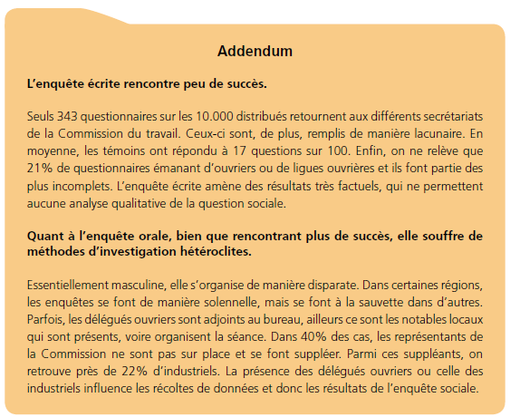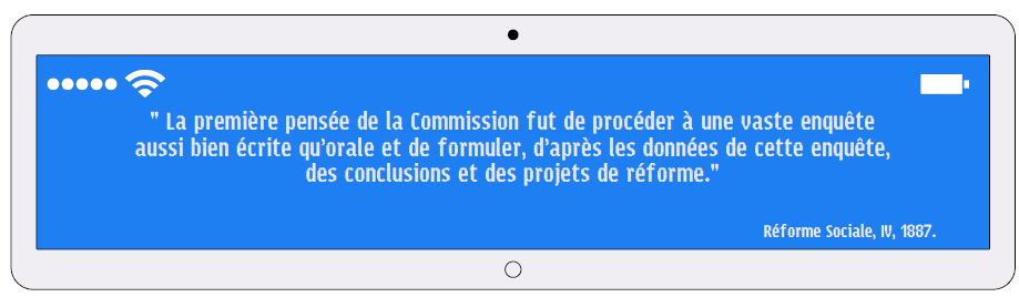 Les travaux de la Commission d’enquête s’étendent entre avril 1886 et juin 1887. La Commission emploie deux techniques pour mener son enquête dans le milieu ouvrier : l’oral et l’écrit. Mais la tâche est gigantesque et les méthodes de récolte de données sont variées.