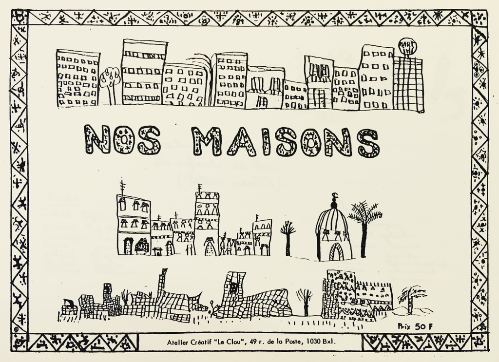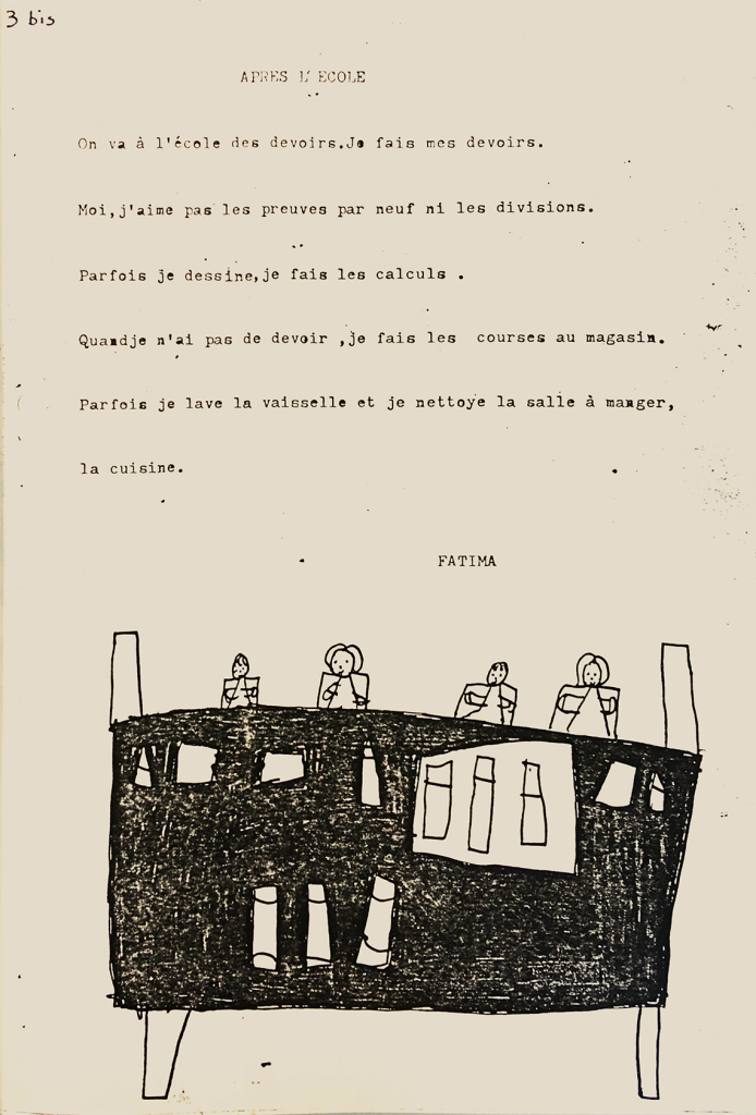 Elle apporte également un témoignage sur les activités d’Hypothèse d’école des années 1981 et 1982, une période pour laquelle nous avons peu d’éléments. Par contre, la collaboration souhaitée avec les instituteur.trice.s ne se fait pas. Lors des rencontres qu’elle organise, elle découvre une profession désarmée face à des classes surpeuplées, fréquentées par des enfants qui ont des niveaux très variables et des problèmes d’apprentissage quasi insolubles. Certain.e.s sont désabusé.e.s et laissent passer. D’autres font face et cherchent des solutions, sans beaucoup de soutien au sein de l’école. L’étudiante concentre aussi son attention sur l’approche culturelle du milieu des enfants en privilégiant la rencontre avec les parents et rédige des petites monographies sur les familles. Elle évoque le choc culturel entre elle et le milieu. Comme future travailleuse sociale, c’est un apprentissage. Ses analyses des difficultés rencontrées par chaque enfant qu’elle accompagne sont autant d’arrêts sur image sur des habitants d’un quartier du Botanique, à un moment donné, en 1980. Ses annexes publient les projets des enfants dans le cadre de l’atelier créatif : leur journal de bord, la correspondance avec une classe d’enseignement spécial à Malmedy, les carnets de présentation de leur quartier et de leur manière de vivre à Saint-Josse et au Maroc : « Nos maisons », « le Marché du Midi », etc. Ce sont sans doute les seules traces de ces réalisations collectives !