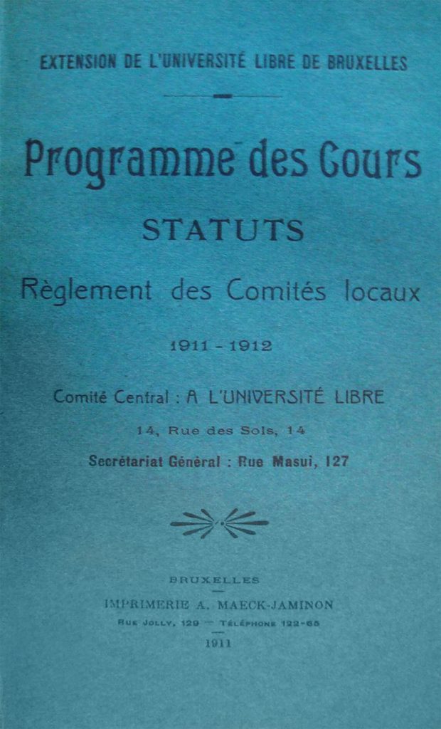 Un comité provisoire s’attèle à élaborer un projet de statuts et à préparer l’assemblée générale fondatrice de la société à laquelle est invitée toute personne intéressée par cette œuvre d’éducation populaire. Un Manifeste précise les intentions poursuivies : « il appartient aux détenteurs du savoir et du pouvoir d’instruire le peuple ou mieux de diffuser la culture dans les masses populaires afin qu’elles participent à cette culture au même titre que ceux qui l’ont élaborée. […] Tous les bons esprits sans distinction d’opinion ont de plus en plus la conscience du devoir qui leur incombe d’élever à eux les masses populaires, de compléter l’éducation du peuple. »[2] Pour les initiateurs, les universités sont les seules capables d’organiser un véritable enseignement populaire : « [En Angleterre], l’éducation populaire n’y a pas été laissée au hasard des bonnes volontés individuelles. Ce sont les universités d’Oxford et de Cambridge qui, avec toutes les ressources scientifiques, ont assumé cette tâche. Les séries de cours organisées par elles dans les milieux en apparence les plus réfractaires à tout effort intellectuel ont réussi au-delà des prévisions les plus optimistes. Nous nous proposons de les imiter et venons faire appel à vous pour nous aider à créer une société intimement rattachée à l’Université libre de Bruxelles qui se chargera d’organiser des cours populaires d’enseignement supérieur avec le concours de toutes les associations qui voudront bien s’intéresser à l’œuvre ».[3]