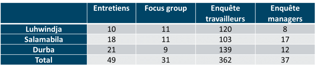 Dans chaque concession, nous avons réalisé des enquêtes avec les travailleurs et travailleuses dans les entreprises sous-traitantes. Nous avons également enquêté auprès des managers des sous-traitances. Chaque enquête comportait un volet quantitatif, qui nous a permis de faire des statistiques descriptives, et un volet qualitatif, que nous avons analysé avec le logiciel NVivo (logiciel d’analyse qualitative de données). Ensuite nous avons complété l’information avec des interviews des acteurs clés dans les entreprises minières et les communautés locales, et des focus groupes avec les travailleurs et les travailleuses, ainsi qu’avec les membres des communautés.