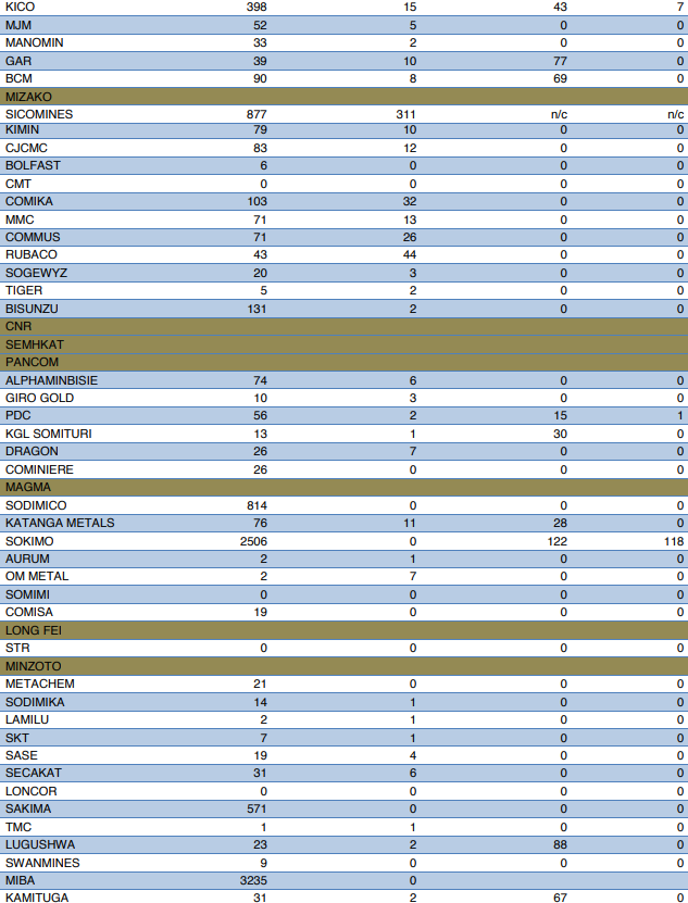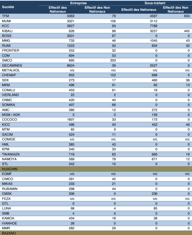 Les projets des grandes entreprises minières sont intensifs en capital et en technologie, et utilisent peu de main-d’œuvre. Ceci est illustré par le tableau tiré du rapport de l’initiative pour la transparence dans les industries extractives (ITIE) de 2015 . Le tableau montre les effectifs des nationaux et étrangers dans les sociétés minières et pétrolières, ainsi que dans les sous-traitances. On constate qu’au total, les entreprises minières créent presque 80 000 emplois, dont presque 50 000 directs, et 30 000 à travers les sous-traitances. L’entreprise Tenke Fungurume (TFM), située à Fungurume, dans la province du Lualaba, dans la partie sud-est de la RD Congo, occupe la première place sur la liste. TFM emploie 3 442 personnes directement, dont presque toutes sont des nationaux. Mais il faut savoir que cette entreprise est la plus grande entreprise cuprifère du pays, représentant 20 % de la production de cuivre en 2015 . Dans les années 1970, à l’apogée de la Gécamines, principale société minière à l’époque, celle-ci employait environ 33 000 personnes. La différence est notable.