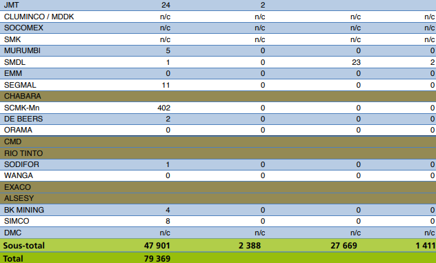 Nombre de travailleurs dans les entreprises minières actives en RDC et mentionnées dans le rapport annuel de l’ITIE