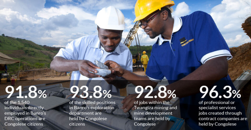 Quand on observe les rapports sur la responsabilité sociale de la société Banro (Twangiza et Namoya dans le tableau précédent), on constate que les chiffres sur le « contenu local » dans le personnel sont très favorables. Ceux-ci datent de 2017 et montrent qu’à l’époque, presque 92 % des employé.e.s étaient des nationaux, soit plus que 96 % des emplois créés dans les sous-traitances.