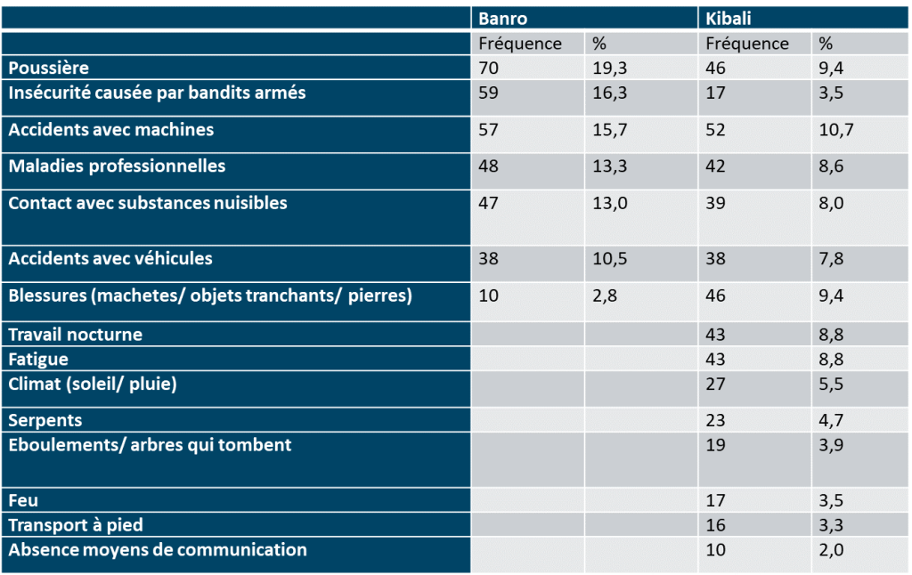 Deuxième constat : Le travail dans les mines peut être pénible et dangereux. 79 % des enquêté.e.s dans les différentes concessions disent parfois travailler dans des conditions désagréables, alors que 74,8 % disent faire face aux risques pendant le travail chez Kibali, et 76,9 % chez Banro.