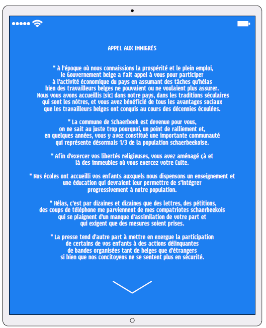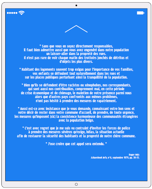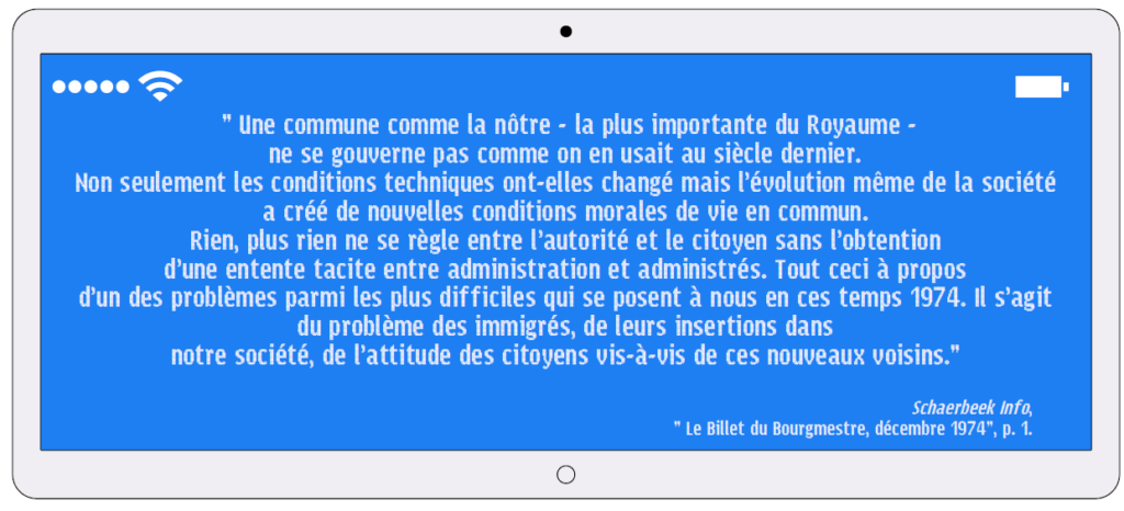 À partir de 1974, les discours de Roger Nols tendent de plus en plus à faire de l’immigration un combat politique et électoral. Il décrit les étrangers comme étant structurellement et intrinsèquement, de par leur culture et leurs habitudes, incompatibles avec la société belge. Pour lui, ils sont la cause potentielle ou effective des problèmes socio-économiques de la commune de Schaerbeek. Accentuant les enjeux sécuritaires, il les accuse d’incapacité à prendre place dans la société belge, voire de violences. Ces discours ne se basent sur aucune donnée scientifique vérifiable et rentrent dans une dynamique raciste. Ainsi, ils reposent essentiellement sur des stéréotypes qui stigmatisent les individus et, ce faisant, les séparent. Selon Roger Nols, il y aurait un « eux » et un « nous ». Cette pensée atteint son paroxysme en 1979, avec la publication d’un « Appel aux immigrés » pour le bulletin communal Schaerbeek Info.