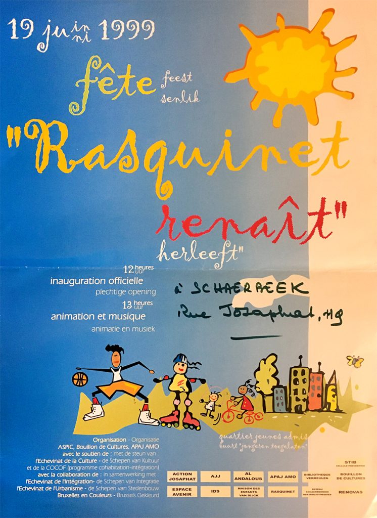 Avec la création du Comité Schaerbeek plage et du groupe « Rasquinet-Josaphat pour la défense du terrain d’aventure et l’espace vert », le relais est pris. L’asbl Rasquinet peut désormais se concentrer sur ses objectifs premiers : les ateliers créatifs et le soutien scolaire.