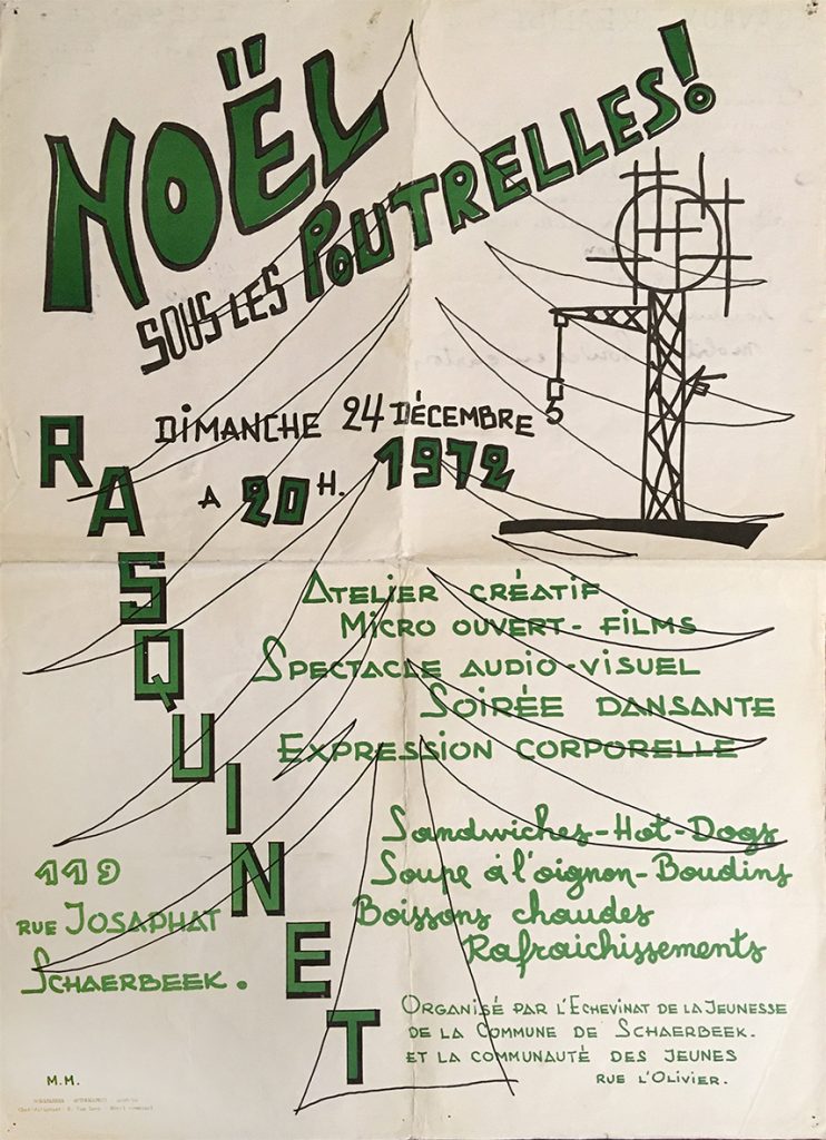 Les jeunes de l’Olivier avaient pris l’habitude d’organiser pour la Noël, une animation dans le quartier, avec guitares, chants et distribution de soupe à l’oignon[3]. Quand Pierre Massart sollicite auprès de l’échevinat de la Jeunesse de Schaerbeek, la mise à disposition de l’ancienne usine, au moins les jours de pluie, l’échevin lui demande d’organiser, pour les jeunes du quartier, un réveillon dans les anciens halls de l’usine.