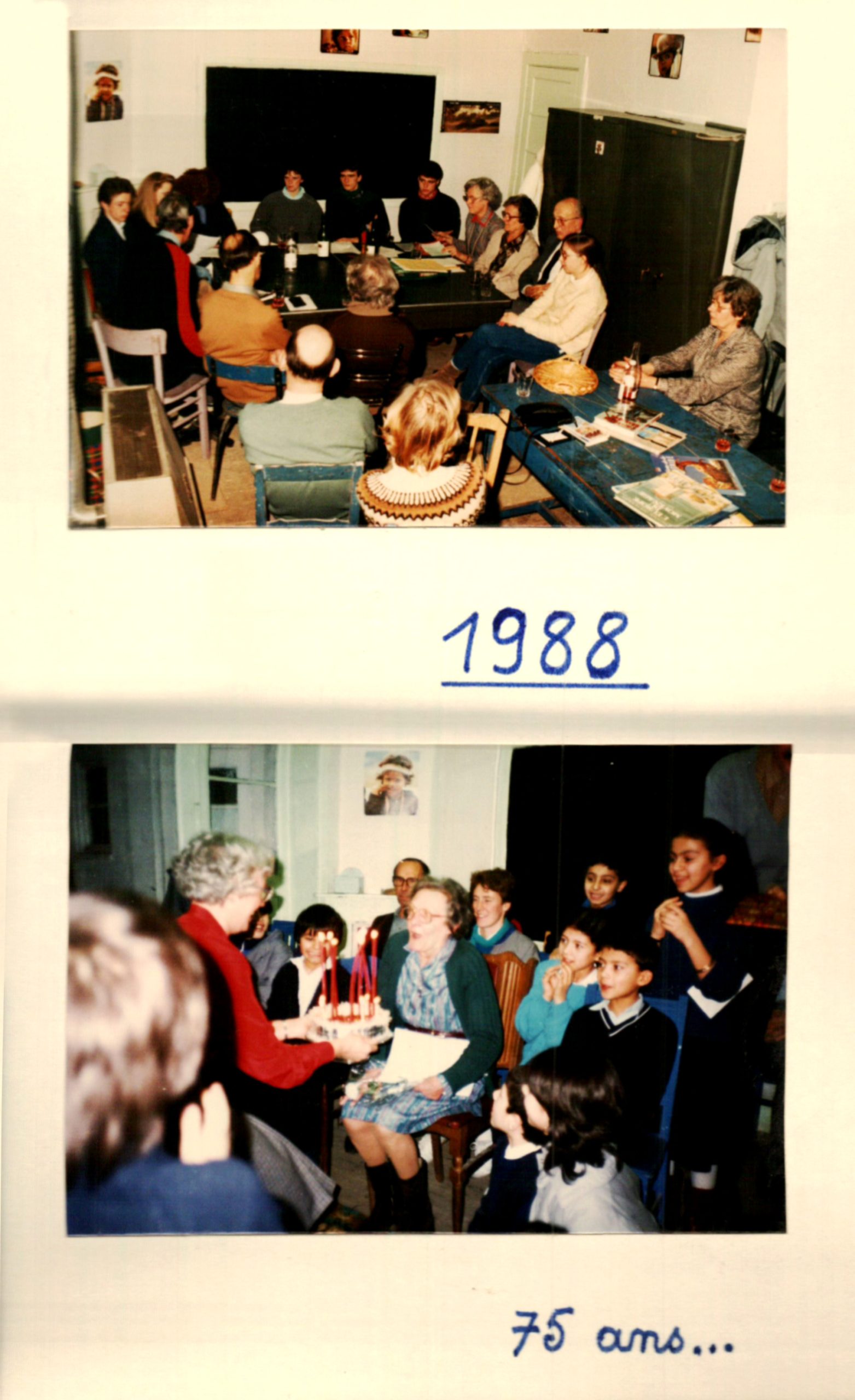 En 1974, comme responsable permanente bénévole[24], Sœur Renée Ponette prend le pilotage de l’école de devoirs et reste à la barre jusqu’à ses 85 ans. D’une vitalité et d’un dynamisme remarquables, elle en assure chaque jour le bon fonctionnement[25], car si Pierre passe tous les jours pour saluer ce petit monde, il s’occupe rarement directement des enfants[26]. Elle marque de son empreinte les enfants qui passent par-là, ainsi que bon nombre de collaborateurs et collaboratrices qui se souviennent d’une femme chaleureuse et ouverte. Elle n’hésite pas à s’engager, avec Pierre et Jeanne, quand il faut trouver des solutions pour répondre à la crise du logement dans la création de l’asbl ANWIM-ALI. Ils forment un trio solide qui s’investit pendant plus de quarante ans dans l’association ce qui est assez exceptionnel. En 1979, Pierre rappelle que le projet « repose sur une équipe stable qui y consacre beaucoup de temps, habite le quartier et dont l’un des membres est permanent à temps plein […]. Cette équipe est constituée essentiellement de deux religieuses et d’un religieux, facteur important de durée et qui fait réfléchir au sens « d’une communauté attachée à une œuvre déterminée »[27]. Ce que Pierre ne cite pas, mais qu’évoque Jeanne Verstraeten dans son entretien, c’est une très grande confiance et fidélité. Chaque lundi, Renée Ponette, Pierre Massart et elle-même se retrouvent pour partager une lecture et un repas, une discussion et échanger sur la situation. Alors que Pierre, vu ses nombreux engagements, est finalement peu présent dans la vie quotidienne de Rasquinet, cette rencontre hebdomadaire permet de préciser les urgences, les lignes de force et d’assurer la continuité du projet[28].