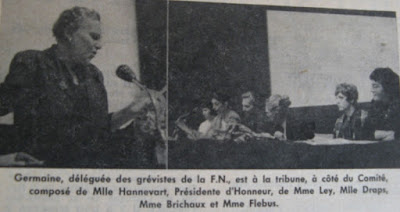 Mais Germaine n’est pas seule : « Nous étions quelques femmes à nous voir souvent à l’usine dans les groupes (les unités de production) et aux toilettes. On parlait politique comme les hommes. Une femme qui a travaillé des années à l’usine fait aussi bien de la politique qu’un homme. Elle connaît mieux la politique, car c’est elle qui a le porte-monnaie pour vivre, et l’homme ne l’a pas ! On nous parlait de l’égalité des salaires depuis des mois et des mois. Comme on ne voyait rien qui changeait, nous parlions beaucoup de grève entre nous, et avec les ouvrières. Nous étions connues des ouvrières depuis des années ; je parlais dans toutes les assemblées syndicales et je poussais les autres à parler. C’est nous qui avons arrêté les machines et appelé toutes les ouvrières à la réunion. J’en ai même battu une qui ne voulait pas arrêter. On ne s’appelait pas Comité d’Action à l’époque, mais nous étions vraiment un groupe d’ouvrières qui agissions ensemble. Quand la grève a été déclenchée, nous avons pris le nom de Comité d’Action.[10] ».