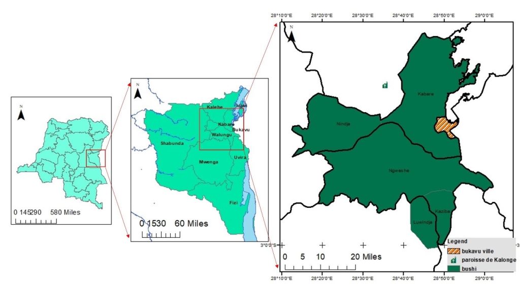 L’entité géographique du Bushi (carte 1) abordée dans cet article dépasse celle du Bushi réduite dans une acception uniquement politique aux seules chefferies ou collectivités locales de Kabare et de Ngweshe. Elle intègre cinq autres royautés (Kaziba, Luhwinja, Burhinyi, Ninja et Kalonge) qui, par la culture (langues, mœurs, croyances religieuses, institutions économiques et socio-politiques communes), constituent depuis des siècles les fondements de l’unité des Bashi, peuple habitant le Bushi.[5]