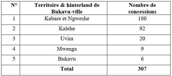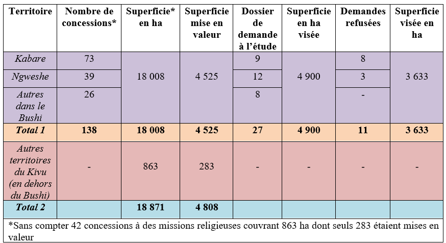 Les statistiques ci-dessous (tableau 1) renseignent sur la situation de ces concessions en 1931 : sur 18 871 hectares spoliés dans le Kivu, 95 % sont situés dans la région du Bushi.