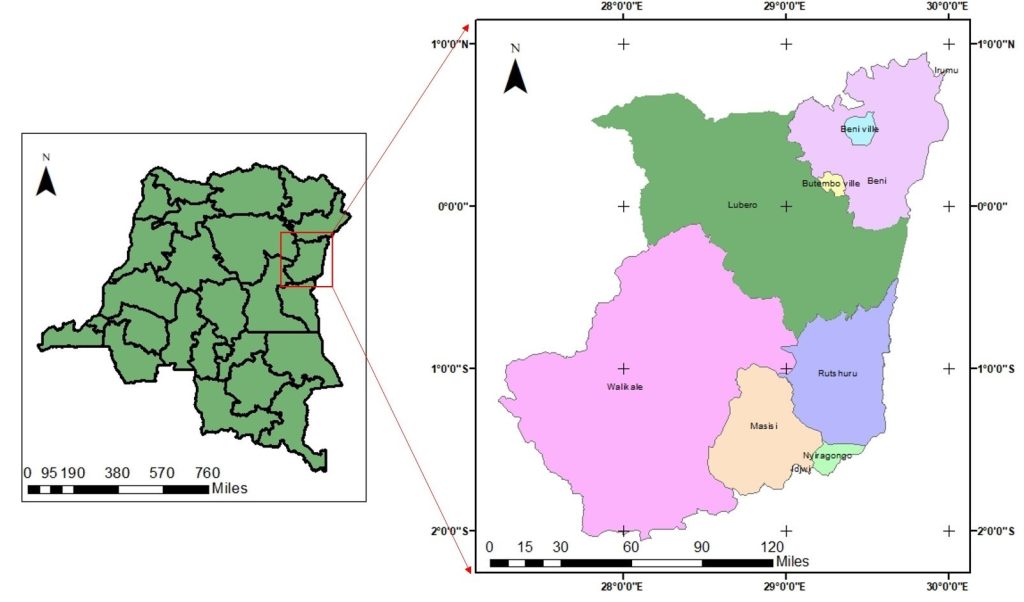 Cette entité fait partie de l’actuelle province du Sud-Kivu, issue de la division de l’ancienne province du Kivu en trois provinces : le Sud-Kivu, le Nord-Kivu et le Maniema. Même si cette recherche se focalise sur le Bushi, les faits relatés trouvent des échos ailleurs en République démocratique du Congo[7], dans les territoires de Rutshuru et de Lubero[8] (carte 2) par exemple.